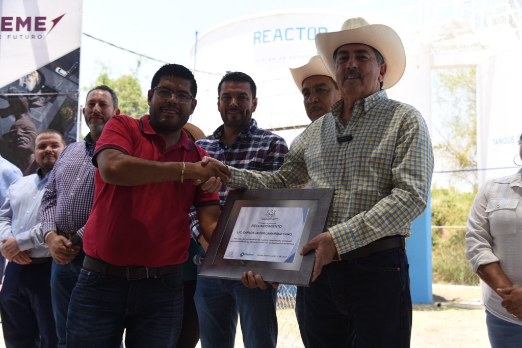 Durante el evento, el munícipe recibió un reconocimiento de parte del ciudadano David Argüelles del comité ciudadano del agua de Hornos por el compromiso y trabajo de su administración en favor del bienestar de los habitantes de esta comunidad.