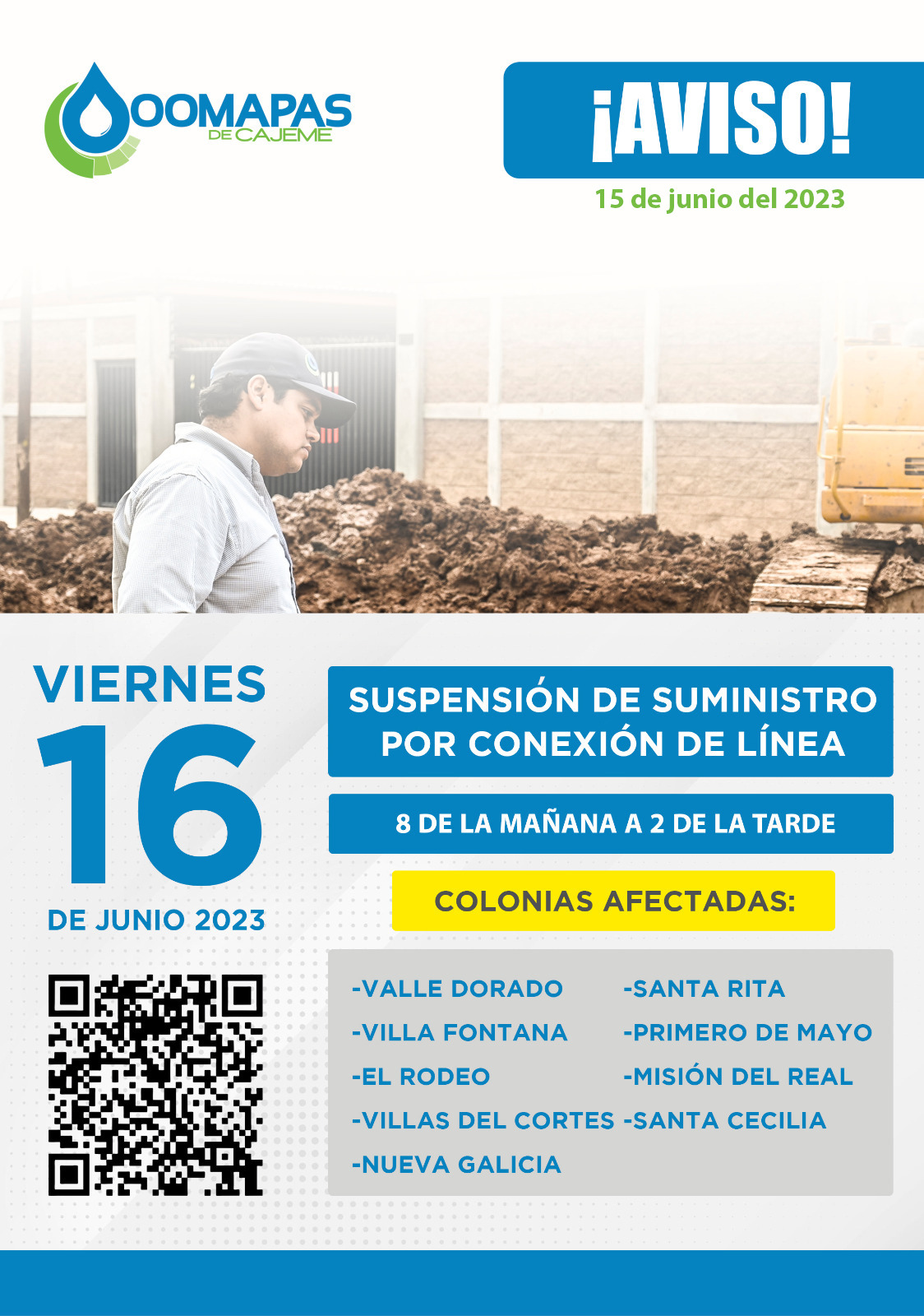¡Atento aviso! a los habitantes de Valle Dorado, Villa Fontana, El Rodeo, Villas del Cortes, Nueva Galicia, Santa Rita, Primero de Mayo, Misión del Real y Santa Cecilia.