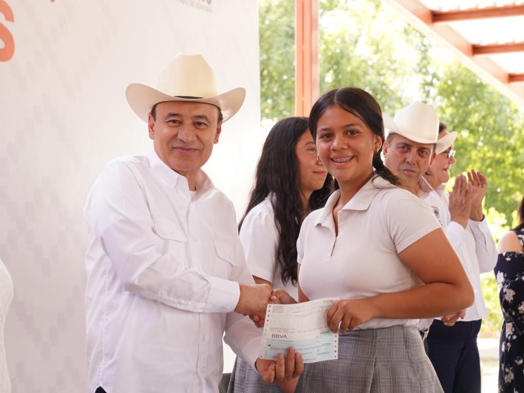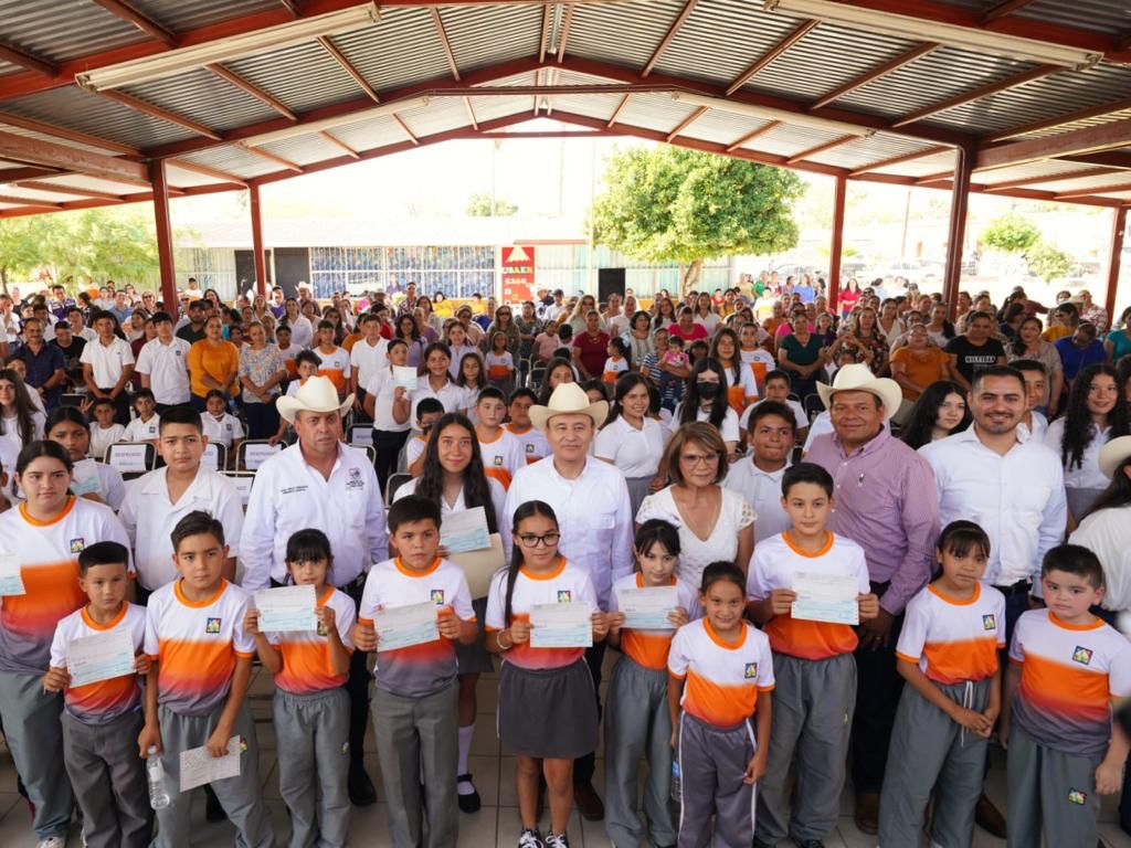 En Huépac se entregaron becas para estudiantes de este municipio así como para San Felipe y Banámichi, donde se benefició diractamente a 355 niñas y niños para que puedan seguir adelante con sus estudios.