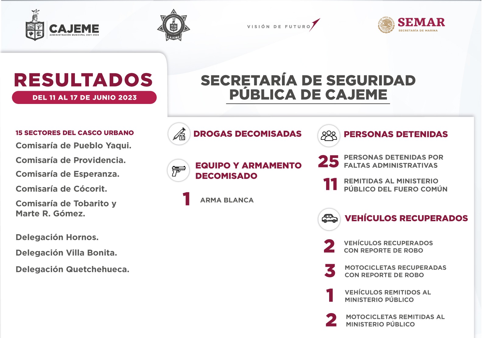 Durante la semana de trabajo, la Policía Municipal se encargó de asegurar un arma blanca, así como de recuperar dos vehículos con reporte de robo y tres motocicletas con reporte de robo, además de remitir al Ministerio Público tres unidades.