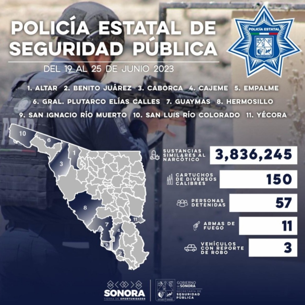 Policías Estatales generaron mayor número de aseguramientos en Hermosillo, Cajeme, Empalme, Guaymas, Yécora, San Luis Río Colorado, San Ignacio Río Muerto, Altar, General Plutarco Elías Calles, Benito Juárez y Caborca; sin embargo, se mantienen en el resto de los municipios para continuar con la estrategia del Gobierno de Sonora para combatir y prevenir el delito.