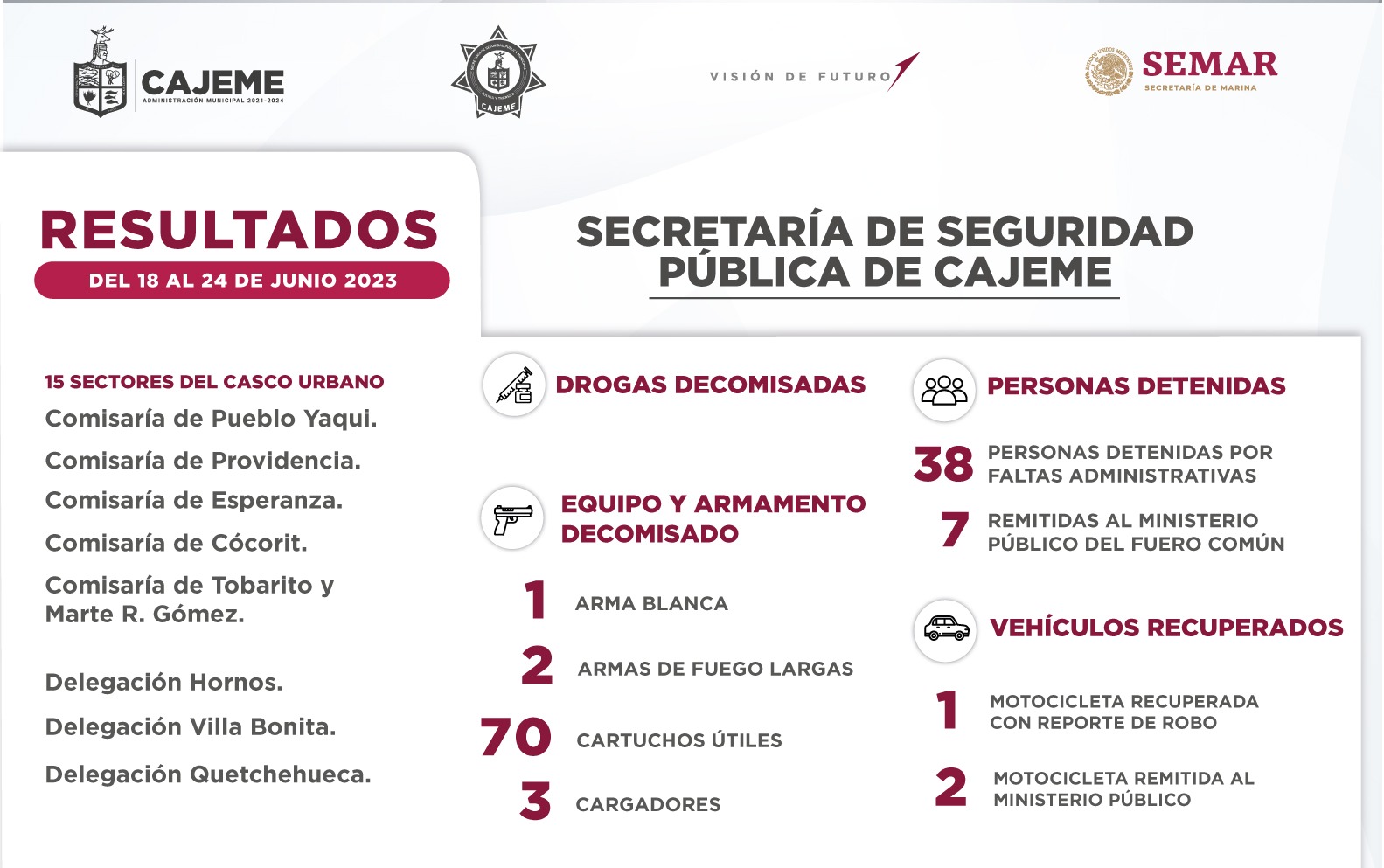 Las acciones de la Secretaría de Seguridad Pública en Cajeme dieron como resultado un total de 45 personas detenidas por elementos de la Policía Municipal en coordinación con la Secretaría de Marina y las diversas corporaciones, de los cuales 38 fueron por faltas administrativas y 7 se turnaron al Ministerio Público del Fuero Común.