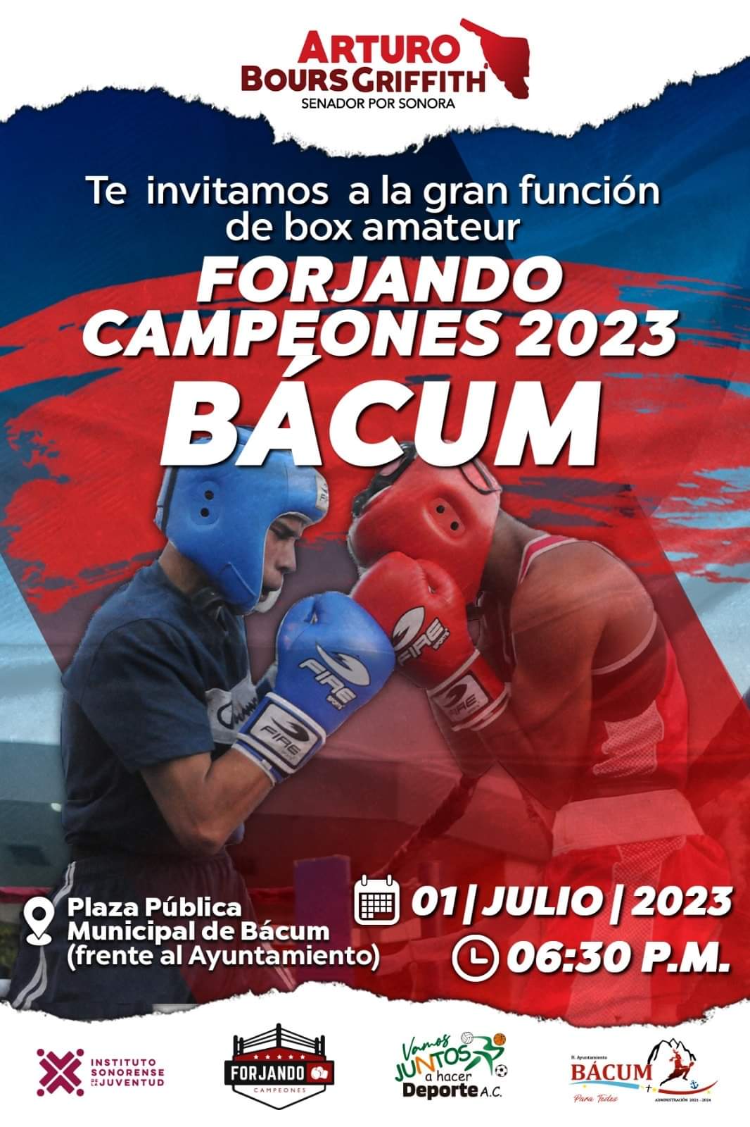 El H. Ayuntamiento de Bácum en coordinación con el senador Arturo Bours Griffith Ies hace una invitación este sábado 01 de julio a la función de box amateur “Forjando Campeones 2023”, con el fin de promover el deporte ya que es la mejor herramienta para prevenir conductas antisociales.