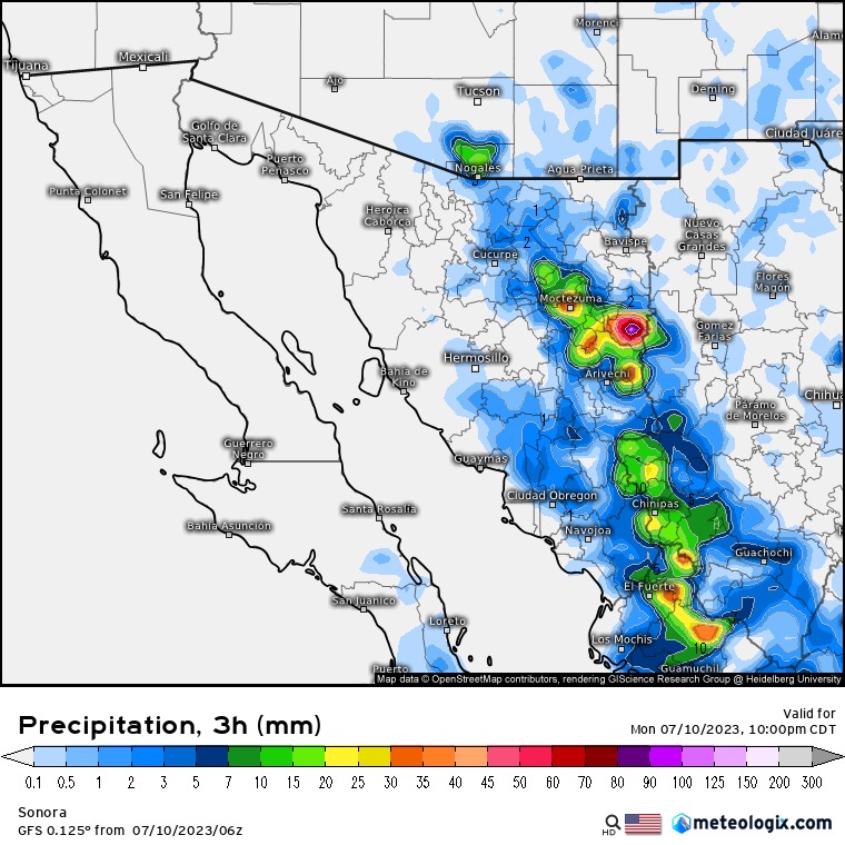 Las precipitaciones podrían estar por arriba de los 25 milímetros de lluvia acumulada en los municipios de Ímuris, Nogales, Cucurpe, Arizpe, Banámichi, Cumpas, Moctezuma, Huasabas, Granados, Divisaderos, Baviácora, Ures y San Pedro de la Cueva.