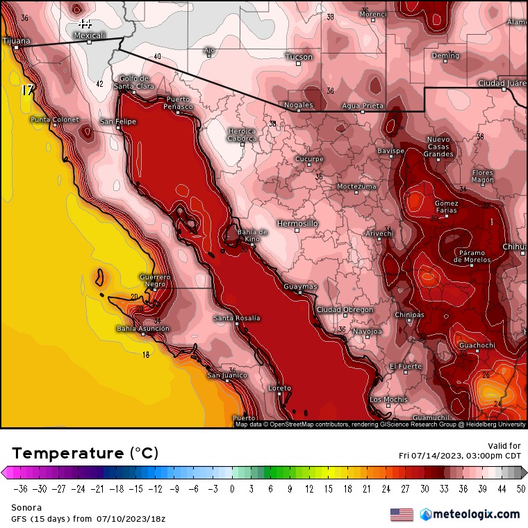 Para el día Viernes 14 de Julio se esperan temperaturas superiores a los 45°C, que, en conjunto con el patrón de alta humedad en el estado, podría elevar las sensaciones térmicas hasta los 50°C.