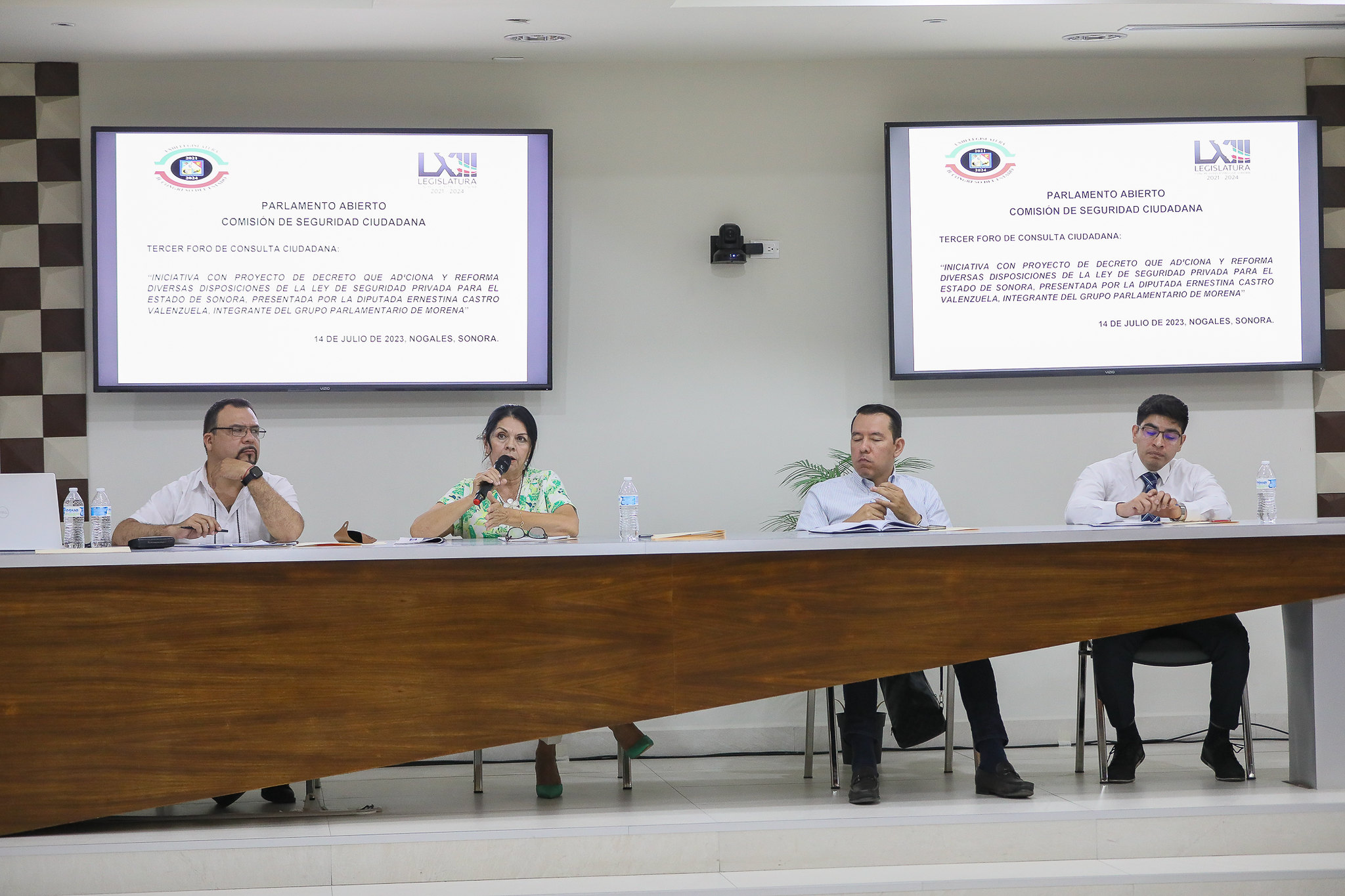 Nogales.- Con los resultados de los tres foros de consulta que se llevaron a cabo en Cajeme, Hermosillo y este municipio, la Comisión de Seguridad Ciudadana se abocará al estudio de las propuestas recibidas vía Parlamento Abierto y en la página web del Congreso del Estado, sobre la iniciativa con proyecto de decreto que reforma y adiciona la Ley de Seguridad Privada del Estado de Sonora, informó la diputada Ernestina Castro Valenzuela.