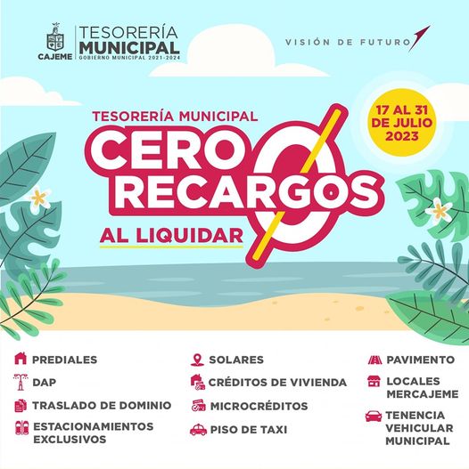 Del 17 al 31 de julio aprovecha los descuentos que Tesorería Municipal tiene para ti. Cero recargos en el pago de tus prediales y demás descuentos.