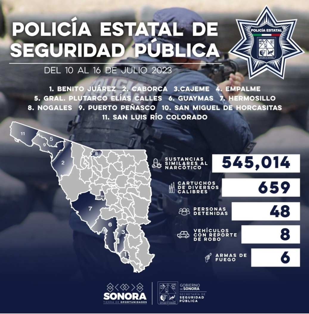 Adicionalmente, durante la semana del 10 al 16 de julio, junto a autoridades de seguridad de los tres niveles de gobierno en los diferentes municipios de Sonora, fueron aseguradas 48 personas en flagrancia delictiva.