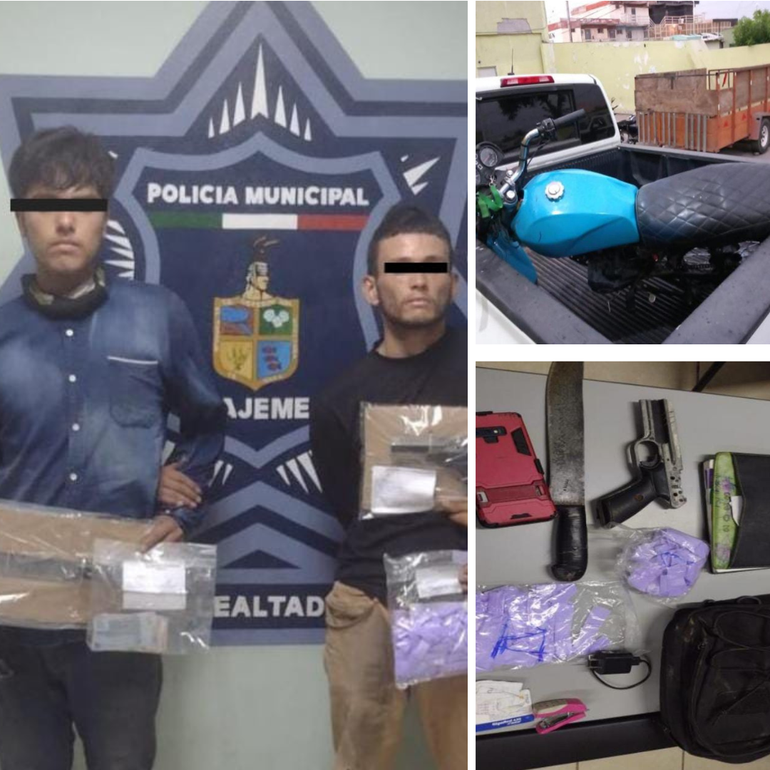 Los detenidos fueron identificados con los nombres de José Alejandro “N.”, de 18 años y Andres Antonio “N.”, de 20 años, a quienes se les aseguró un arma prohibida tipo machete y una pistola hechiza, además de 89 envoltorios de cristal.