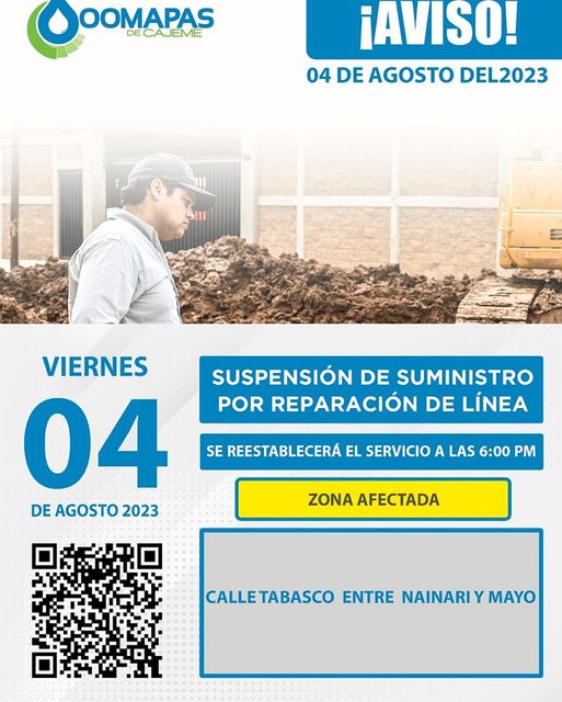 Por reparación de linea, se suspendera suministro de agua este viernes 04 de agosto, en el sector de la calle Tabasco entre Avenida Nainari y calle Mayo por aproximadamente tres horas a partir de las 15:00 horas