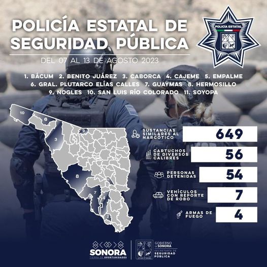 Hermosillo.- En la semana del 7 al 13 de agosto, la Policía Estatal de Seguridad Pública (PESP) en Sonora aseguró 649 dosis de sustancia similar al narcótico con valor aproximado a 19 mil 490 pesos, detuvo 54 personas, incautó cuatro armas de fuego y recuperó siete vehículos con reporte de robo.