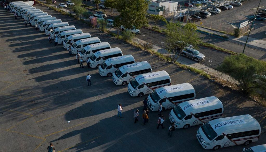 Se entregaron 40 vans (más 10 que actualmente están en operación) para los municipios de Agua Prieta (4), Benito Juárez (3), Caborca (6), Cananea (4), Empalme (5), Huatabampo (4), Puerto Peñasco (3), cinco para el Instituto de Movilidad y Transporte para el Estado de Sonora (Imtes), y tres para Etchojoa y Magdalena, municipios en los que, por primera ocasión, entrará el servicio en operación.