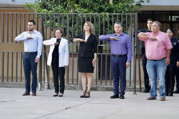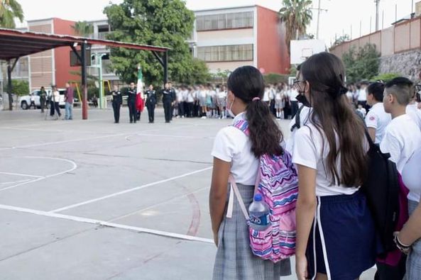 Junto a María Dolores del Río Sánchez, secretaria de Seguridad Pública, en el marco del inicio de clases en la escuela secundaria 24 “Profesor Alejandro Sotelo Burruel”, el comisario general de la PESP señaló que este innovador programa se realiza en coordinación con la Secretaría de Educación y Cultura (SEC) y tiene la finalidad de fomentar valores como el respeto, amor a la patria y prevención de acoso escolar, acciones con las que se busca generar entornos seguros.