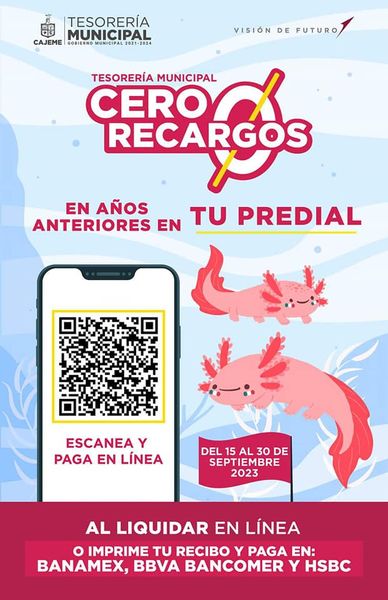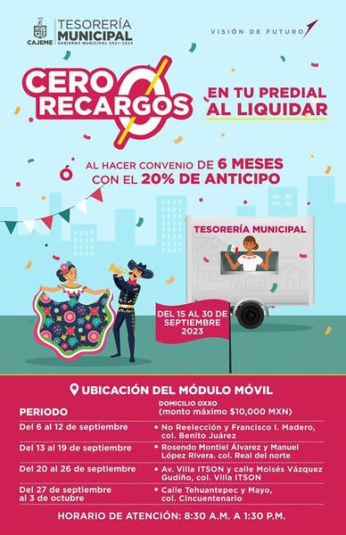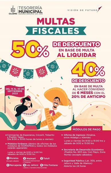 Seguimos con los descuentos de Tesorería Municipal con cero recargos en tu predial al pagar en línea o en ventanilla bancaria y en el módulo móvil, además obtén un 70 por ciento de descuento en tus multas de tránsito y un 50 por ciento de descuento en tus multas fiscales.
