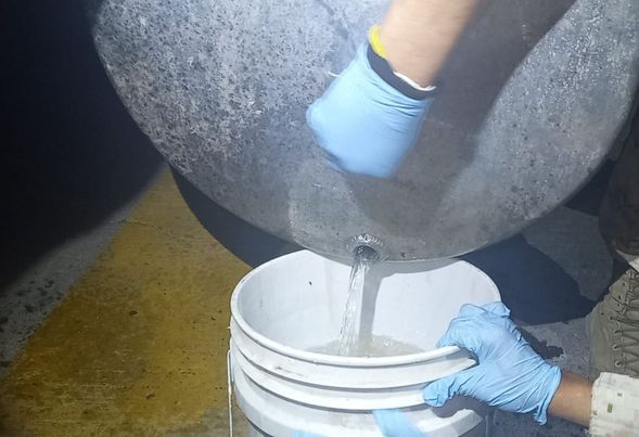 Sin embargo, al continuar la inspección, se percataron de que en la parte inferior de este tanque había un tapón que evidenciaba un segundo compartimento. Al retirarlo, brotó un líquido cristalino con un fuerte olor a químico, resultando positivo a probable metanfetamina.