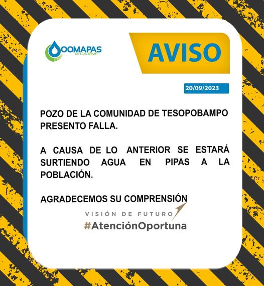 Atención comunidad de Tesopobampo aviso del OOMAPAS de Cajeme