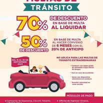 Seguimos con los descuentos de Tesorería Municipal con cero recarqgos en tu predial al pagar en línea o en ventanilla bancaria y en el módulo móvil, además obtén un 70 por ciento de descuento en tus multas de tránsito y un 50 por ciento de descuento en tus multas fiscales.