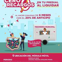 Seguimos con los descuentos de Tesorería Municipal con cero recarqgos en tu predial al pagar en línea o en ventanilla bancaria y en el módulo móvil, además obtén un 70 por ciento de descuento en tus multas de tránsito y un 50 por ciento de descuento en tus multas fiscales.