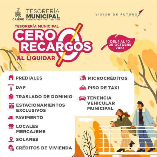 Inicia octubre con los descuentos que Tesorería Municipal tiene para ti. Aprovecha y ponte al día en el pago de tus impuestos con Cero Recargos al liquidar.