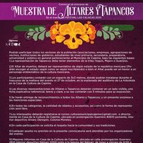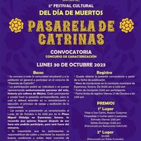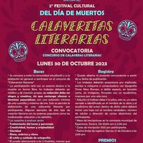 En efecto, con el fin de celebrar el tradicional Día de Muertos, el Gobierno Municipal, a través la Subdirección de Cultura y con el apoyo de la Secretaría de Turismo, convoca a participar en el Festival Cultural de las Calacas 2023, mismo que incluye diversas festividades a celebrarse del 27 de octubre al 5 de noviembre en distintas comunidades y escenarios de la localidad en las que habrá muestra de altares y tapancos, desfile de catrinas y catrines, calaveras literarias, exposiciones pictóricas, música, danza, teatro y manualidades, entre otras actividades.