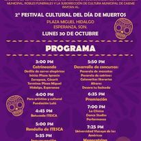 En tanto que, en el segundo Festival de Día de Muertos en Esperanza, las actividades iniciarán a las 15:00 horas del lunes 30 de octubre con un Desfile de Carros Alegóricos que partirá de la plaza Ignacio Zaragoza a la plaza Miguel Hidalgo, donde desde las 16:00 horas habrá concurso de Calaveritas Literarias, pasarelas de Catrinas y Catrines y de Disfraces para Mascotas; así como la premiación a los participantes en el concurso Decora tu Fachada.