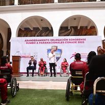 Hermosillo.- El talento y disciplina de cada paratleta sonorense se verá reflejado en cada una de sus participaciones, siempre dejando en alto el nombre del estado, resaltó el gobernador Alfonso Durazo Montaño, al abanderar a la delegación sonorense que participará en las Paranacionales Conade 2023, a celebrarse del 16 de octubre al 2 de noviembre en Cancún Quintana Roo.
