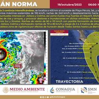 El día de hoy, a las 03:00 hrs, Norma se intensifica rápidamente y ahora es huracán de categoría 3 se localiza a 420 km al suroeste de Playa Pérula, Jal., y a 725 km al sur- sureste de Cabo San Lucas, B.C.S. Presenta vientos máximos sostenidos de 195 km/h, rachas de 240 km/h y desplazamiento hacia el norte a 9 km/h.
