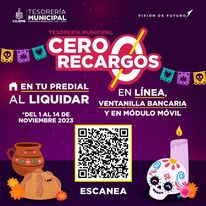 Inicia noviembre y Tesorería Municipal continúa con las promociones de Cero Recargo en tu predial al liquidar si pagas en línea, ventanilla bancaria o módulo móvil, del 1 al 14 de noviembre de 2023.
