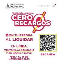Inicia noviembre y Tesorería Municipal continúa con las promociones de Cero Recargo en tu predial al liquidar si pagas en línea, ventanilla bancaria o módulo móvil, del 1 al 14 de noviembre de 2023.