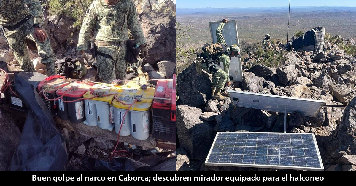Pero una de cal por tantas de arena, porque suponemos resultado de trabajo de inteligencia, se descubrió un campamento de observación o de halconeo en la mera cima del Cerro Cobre II en el municipio de Caborca, desde donde se podía otear cualquier movimiento a muchos kilómetros a la redonda y con dicha información tomar las decisiones correspondientes.