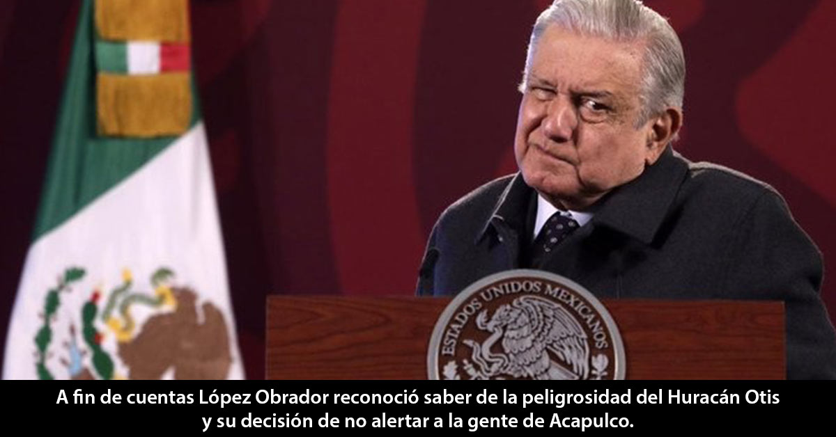 Y el mismo presidente reconoció de forma pública su negligencia criminal al asegurar haber dado seguimiento a los avisos respecto a la evolución del meteoro, pero reaccionó poco después de la ocho de la noche al emitido a eso de las seis de la tarde del martes 24 de octubre, aunque a eso de la una de la tarde de ese mismo día el Centro Nacional de Huracanes advertía que ya se trataba de un huracán categoría 3, suficiente para determinar acciones inmediatas de protección civil.