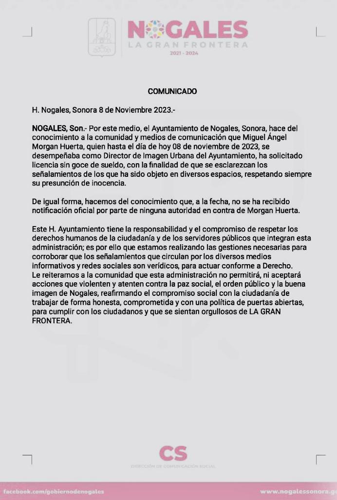 Miguel Ángel Morgan Huerta, hoy exdirector de Imagen Urbana del municipio de Nogales, fue señalado por autoridades de Estados Unidos de operar para el Cártel de Sinaloa y pidió licencia “con la finalidad de que se esclarezcan los señalamientos de los que han sido objeto en diversos espacios, respetando siempre su presunción de inocencia”.