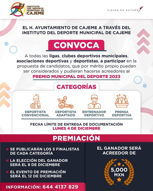 La convocatoria para el Premio Municipal del Deporte de Cajeme 2023 ya está en marcha. Se buscan nominaciones para reconocer a lo más destacado del deporte en nuestro municipio.