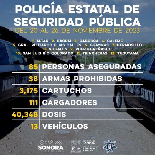 Hermosillo.- Oficiales de la Policía Estatal de Seguridad Pública (PESP) realizaron en la última semana de operativo en Sonora, el aseguramiento de 85 personas, además de incautar sustancias prohibidas y armas de fuego.