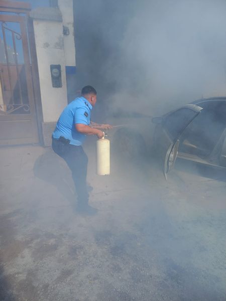 Poniendo de inmediato a salvo al señor José Guadalupe de 69 años y sofocando con un extintor las llamas que amenazaban con propagarse a todo el vehículo y al taller mecánico.
