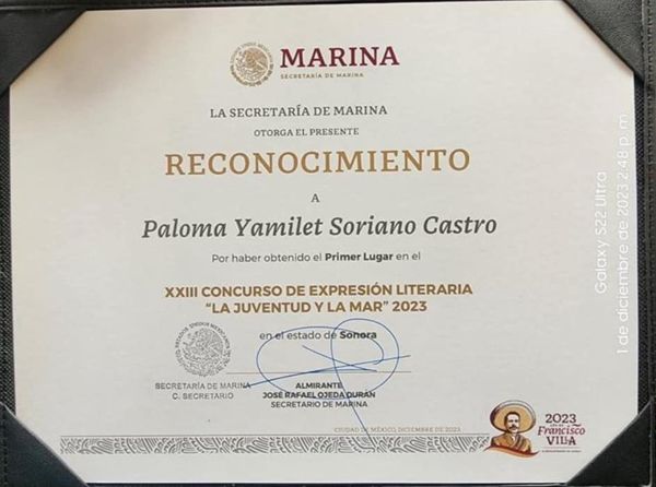 Hermosillo.- Yamileth Soriano Castro, estudiante del Colegio de Estudios Científicos y Tecnológicos del Estado de Sonora (Cecyte), plantel Hermosillo III El Mariachi, ganó el primer lugar del XXIII Concurso Nacional de Expresión Literaria “La Juventud y la Mar” 2023.