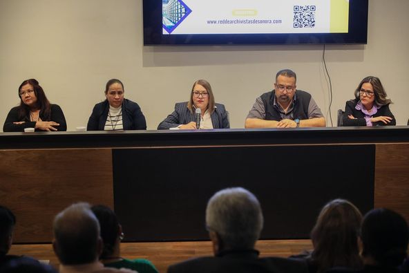 En la rueda de prensa, Karina Mungarro Garibay, coordinadora provisional de Archivos del Congreso local, estuvo acompañada por Patricia Ríos García, Homar Arturo Moreno Ramos, Rosalina Núñez Márquez y Concepción Moya Grijalva, presidenta, secretario, tesorera y encargada de seguimiento y vigilancia, respectivamente, de la Red de Archivistas de Sonora.