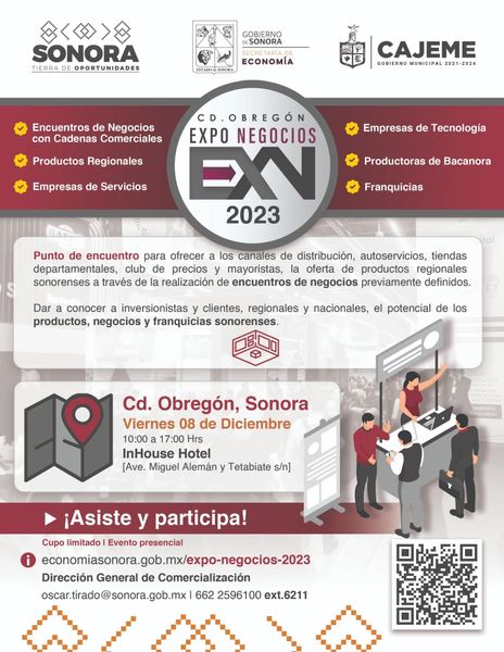 El próximo viernes 8 de diciembre, el municipio de Cajeme será la sede de Expo Negocios Obregón 2023, evento organizado por el gobierno del Estado a través de la Secretaría de Economía y la Secretaría de Desarrollo Económico, en la que se dará a conocer a inversionistas, clientes regionales y nacionales el potencial de los productos, negocios y franquicias de la entidad y la región sur de Sonora, dicho evento tendrá lugar de 10: 00 a 17:00 horas, en las instalaciones del Hotel Inn House.