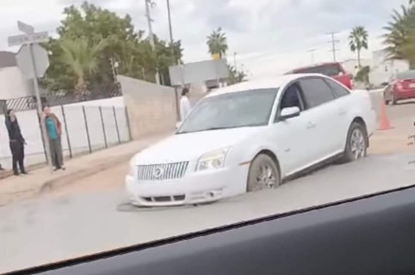 Una distraida conductora cayó con su vehículo al concreto hidráulico recién hecho, justo en los bulevares Luis Encinas y Faustino Félix Serna, en Miramar.