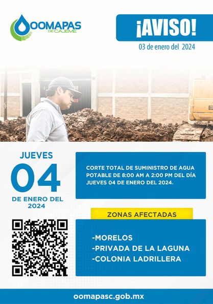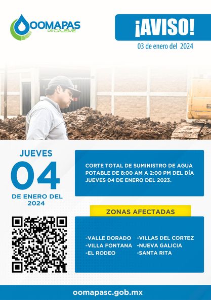 Atención aviso del OOMAPAS de Cajeme mañana habrá suspensión de agua potable en colonias de Ciudad Obregón