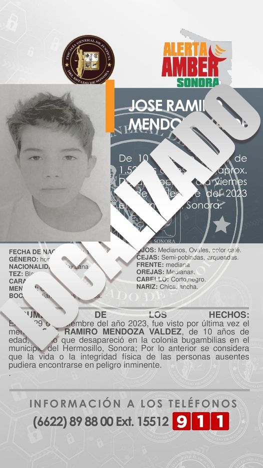 SE DESACTIVA ALERTA AMBER SONORA, SE LOCALIZÓ SANO y SALVO