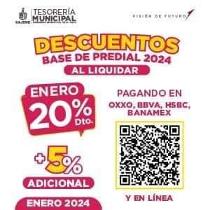 Por el mes de enero, Obtén 20% de descuento en base de predial, más un 5% adicional al pagar en línea, tiendas OXXO, BBVA, HSBC y BANAMEX.