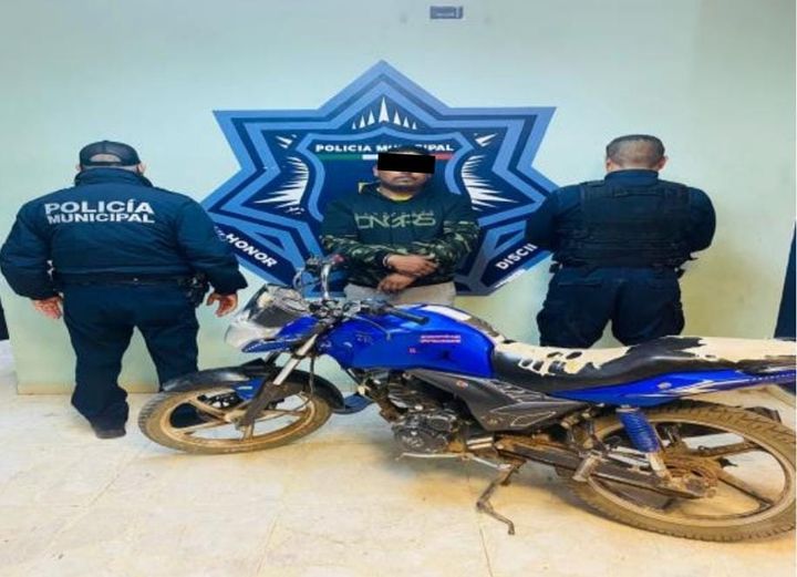 Procediendo a la aprehensión del presunto identificado con el nombre de Adolfo “N.”, de 43 años de edad, a quien se le aseguró una unidad ligera de la marca Italika línea Z-125 CC de color azul con blanco y negro.