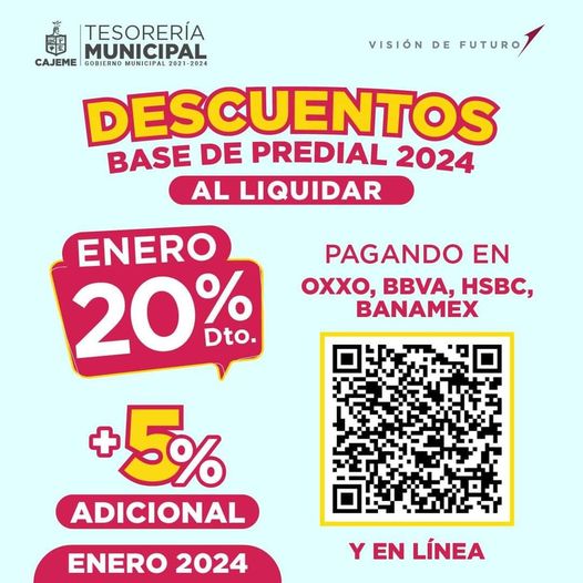 Por el mes de enero, Obtén 20% de descuento en base de predial, más un 5% adicional al pagar en línea, tiendas OXXO, BBVA, HSBC y BANAMEX.