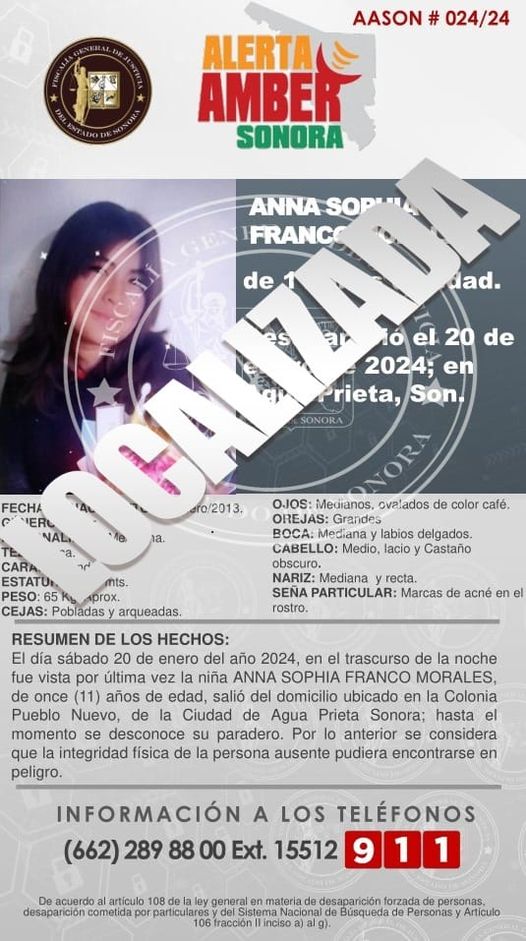 Agradecemos a todos su valiosa colaboración por difundir y contribuir en la localización de la niña ANNA SOPHIA FRANCO MORALES de 11 años de edad, quien se encontraba fuera de casa por cuenta propiaSE DESACTIVA ALERTA AMBER SONORA, SE LOCALIZÓ SANA y SALVA