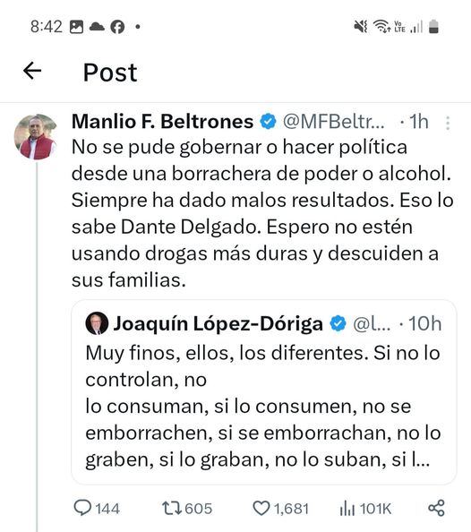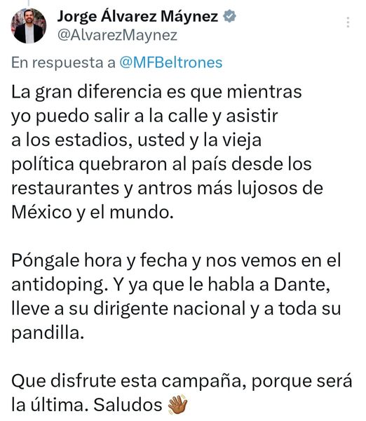 Beltrones le responde a Álvarez Maynez: “No se pude gobernar o hacer política desde una borrachera de poder o alcohol. Siempre ha dado malos resultados. Eso lo sabe Dante Delgado. Espero no estén usando drogas más duras y descuiden a sus familias”, y @AlvarezMaynez le revira: “Póngale hora y fecha y nos vemos en el antidoping; que disfrute esta campaña, porque será la última”…