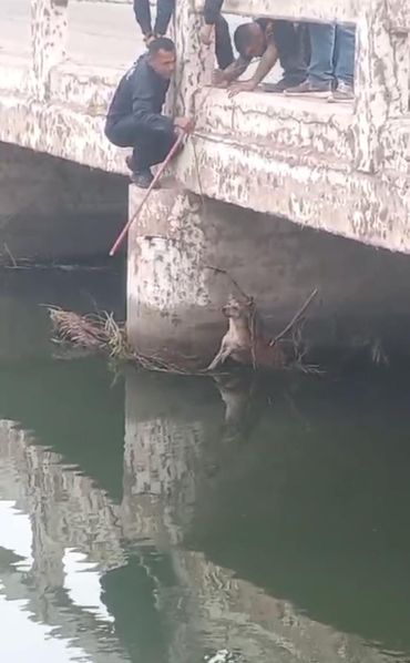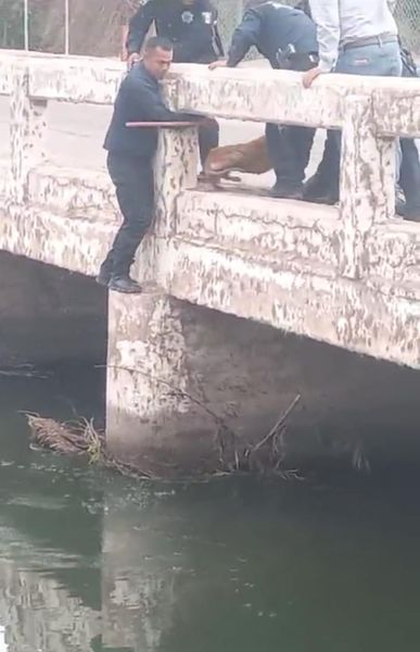 Al darse cuenta de la situación los policías comisionados a la USSI NORTE y grupo UMAV de la corporación policial, descendieron de las unidades para después ingeniárselas con una soga y un palo, material con el que sujetaron al perrito del cuello subiéndolo y liberándolo rápidamente.
