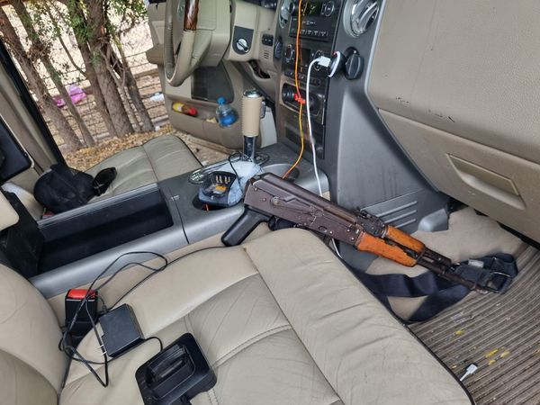 Los integrantes de la institución llevaron a cabo una inspección en la camioneta y se percataron de que contaba con una placa metálica de protección en la parte superior y las ventanillas polarizadas eran de un espesor superior, además de localizar en su interior dos armas largas con sus cargadores abastecidos, así como una caja de plástico que contenía artefactos metálicos conocidos como ponchallantas.