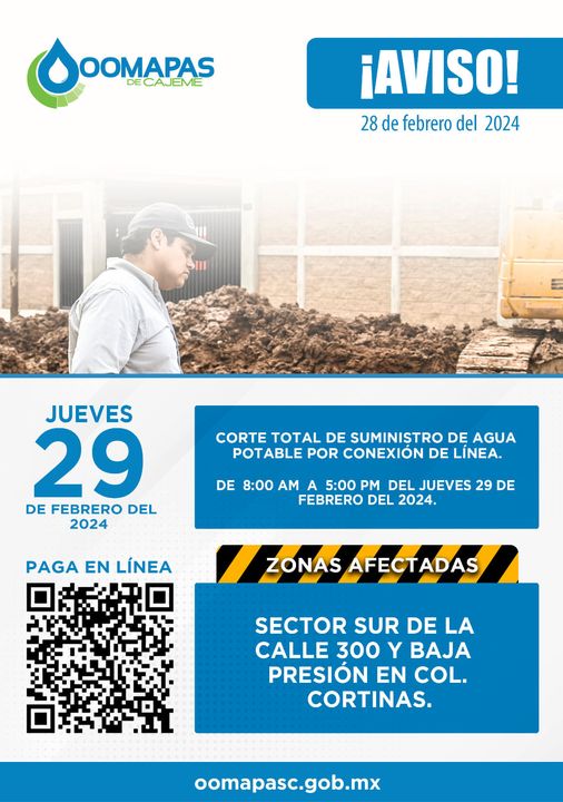 A los habitantes y usuarios del sur de Ciudad Obregón, se les notifica que el día 29 de febrero del 2024 se cortará el suministro de agua de las 8:00 de la mañana a las 17:00 horas ( 5 de la tarde) a todas las colonias al sur de la calle 300.