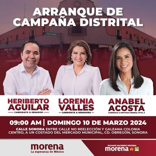 La fórmula de Morena al senado Lorenia Valles y Heriberto Aguilar, junto a la candidata a diputada federal, Anabel Acosta, encabezarán el arranque de campaña distrital mañana domingo en Cajeme #DESPIERTASONORA